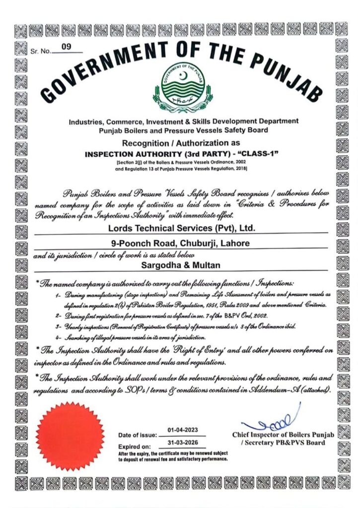 Lords Technical Services (Pvt.) Ltd. is a Government-approved third-party inspection service provider with expertise in industrial boilers and pressure vessels.